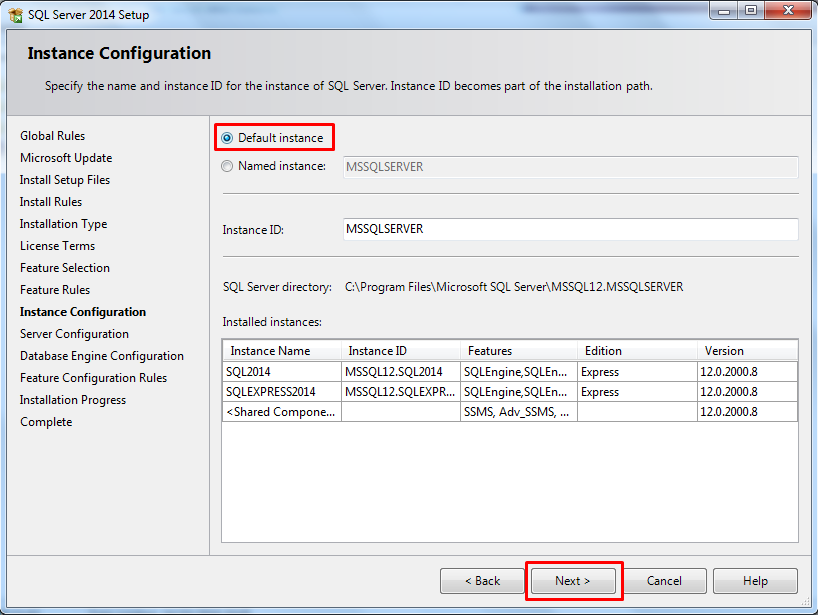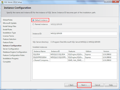 17) Tampil jendela Instance Configure, pilih Default Instance kemudian klik Next .