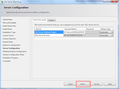18) Pada jendela Server Configuration setting sesuai gambar berikut, kemudian klik Next .