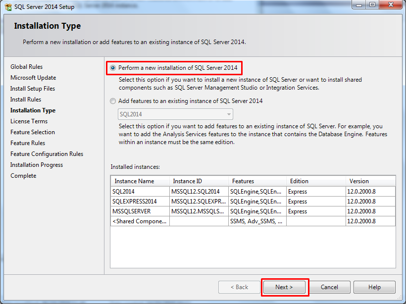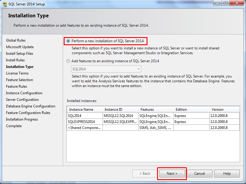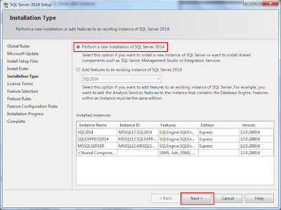 11) Tampil jendela Installation Type, pilih Perform a new Installation of SQL Server, kemudian klik Next .