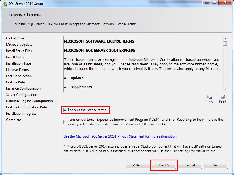15) Pada jendela License Terms, checklist I accept the license terms, kemudian klik Next .